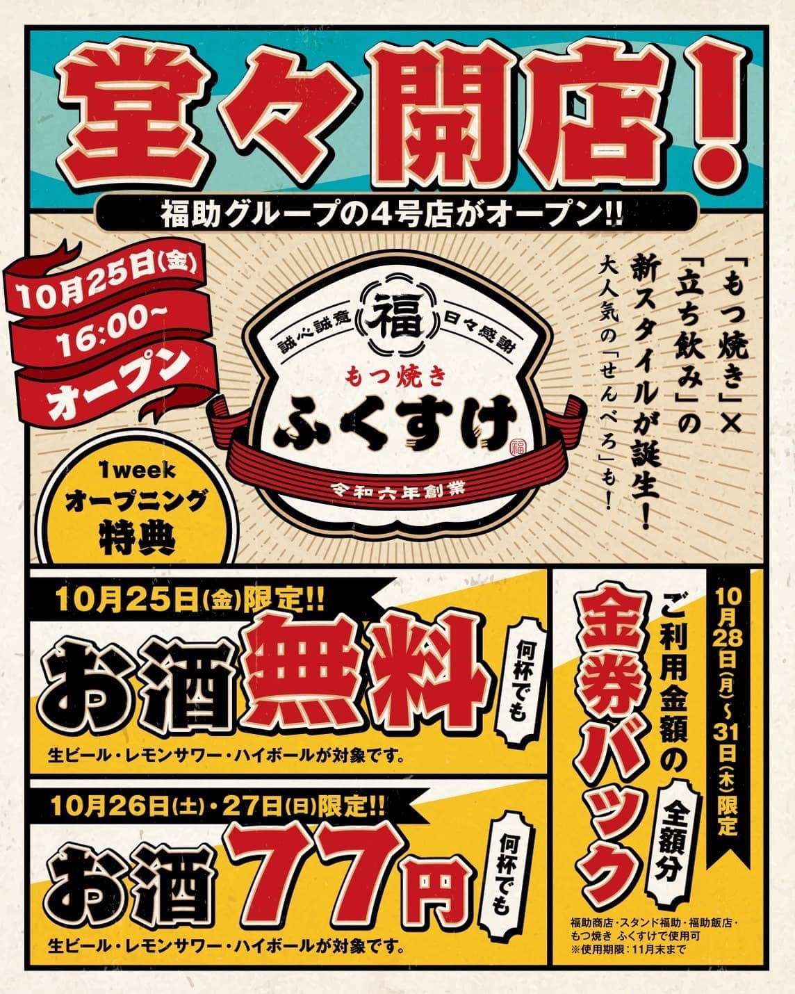「もつ焼き ふくすけ」2024年10月25日(金)16:00よりグランドオープン‼