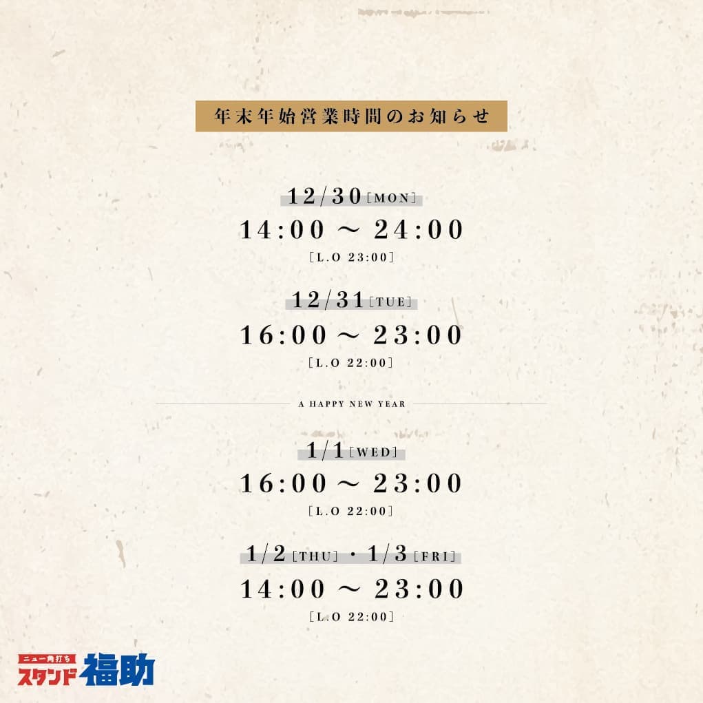 【スタンド福助 年末年始の営業のお知らせ】