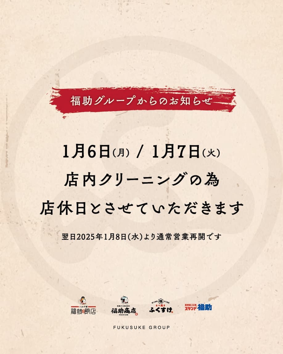 誠に勝手ながら1月6日(月)/1月7日(火)は店内クリーニングの為、全店店休日とさせていただきます。