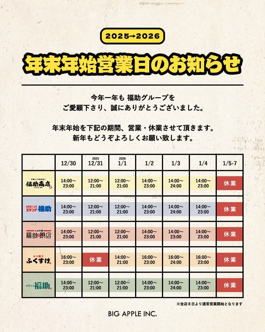 なお、福助グループ各店舗の年末年始の営業時間につきましては、
