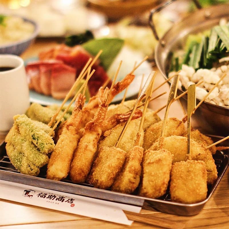 福助商店では、1つ1つの具材によって揚げる時間を変えており、1番美味しくお召し上がり頂ける状態で提供しております。「衣」にもこだわり食感を"サクッ"とさせる為に、衣を極力薄く付けているのも重要なポイントです。お一人様お一つずつ専用の湯呑みに温かいソースを提供させて頂いており、ソースの二度漬け大歓迎。