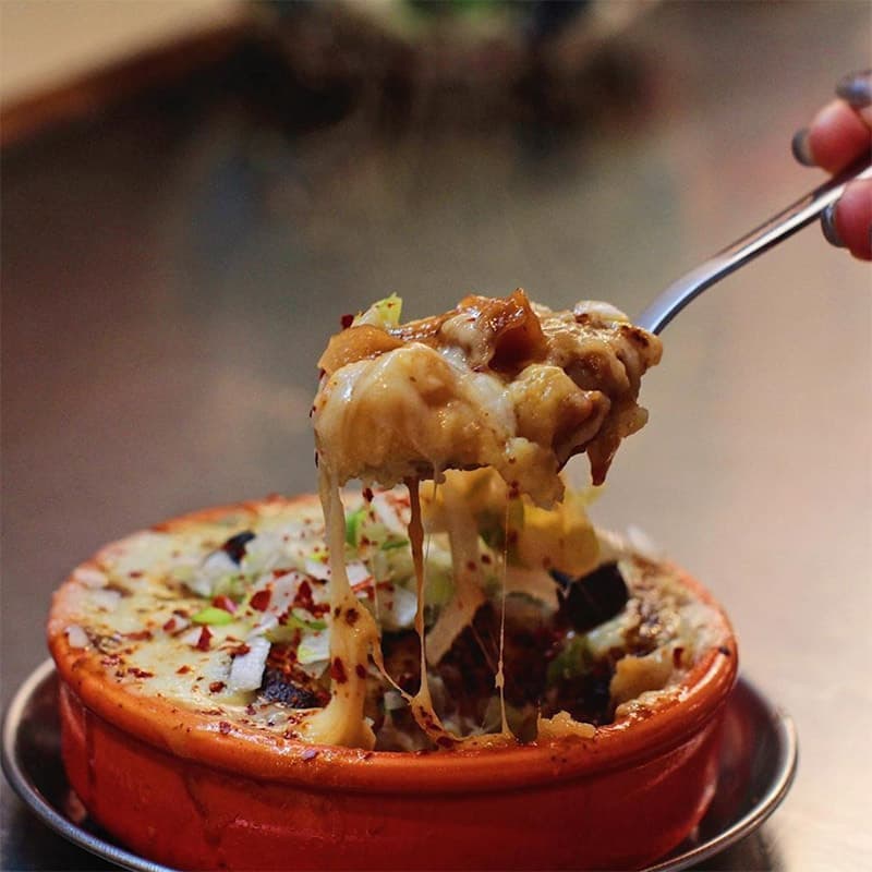 「ぼっかけ」とは、牛すじとコンニャクを甘辛く煮込んだ、郷土料理の1つです。お皿の一番下の層にはマッシュポテト、真ん中に「ぼっかけ」一番上にチーズで蓋をして、鉄板で焼き上げております。焦がしたチーズの香ばしさも食欲をそそる当店自慢の一品です。