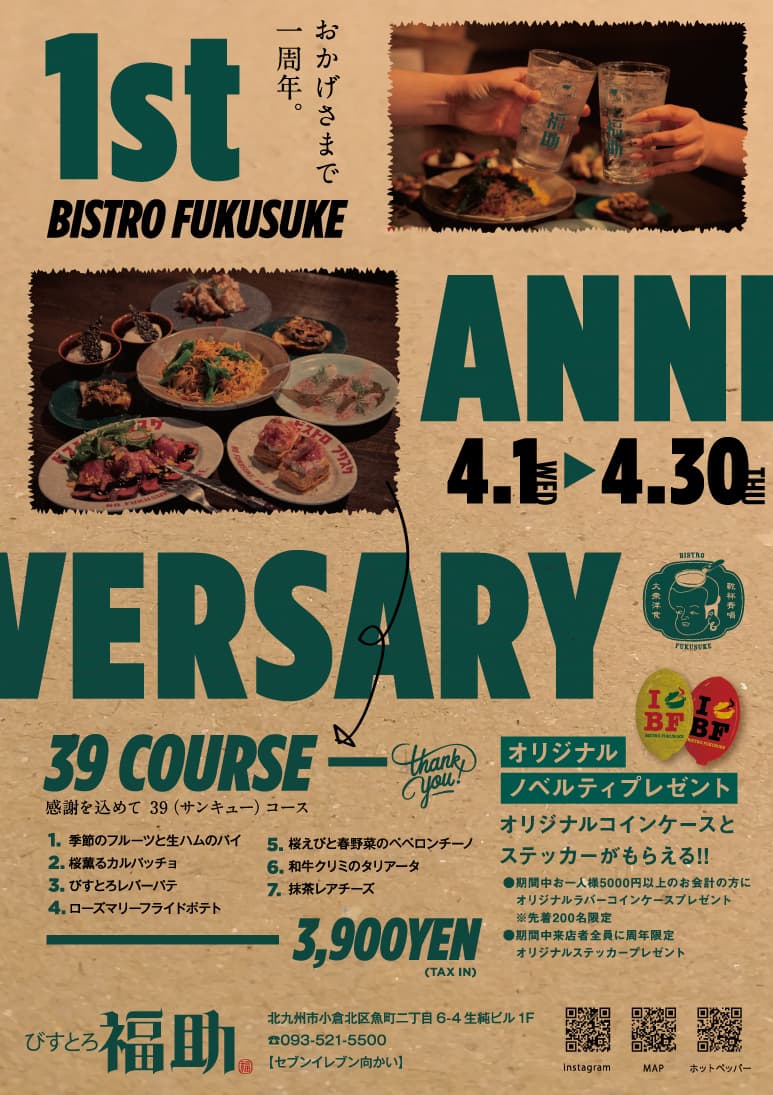 おかげさまでびすとろ福助は、オープンから無事に1周年を迎えることができました。