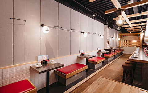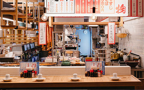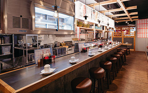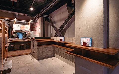 商店街の一角に大きく掛かる暖簾をくぐると、中は全90席の広々とした店内。ちょっとした待ち合わせの利用としても可能な立ち飲み席、店内を見渡せる小上がりのロフト席、店内中央の大きなオープンキッチンをぐるりと囲むL字カウンター。大人数での宴会利用も可能な掘りごたつ席。活気に溢れる店内、流れる懐かしい歌謡曲が心地良い気分に。