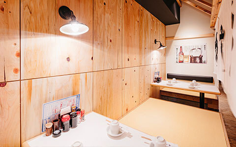 当店の中でも落ち着いた半個室感を味わえるのが「ふくすけシート」人目を気にせずお話し、お食事をお楽しみ頂けます。座敷はタタミ仕様でレトロな灯が照らしてくれます。隠れ家的気分を味わってみませんか? |