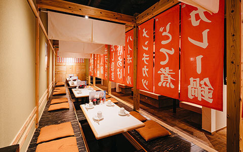 ゆったりと足を伸ばせる人気の掘りごたつ席。2名様〜最大30名様の歓送迎会などの宴会などにもご利用頂けます。少人数でしたら暖簾で区切り、半個室空間としてもご利用頂ける人気のお席です。 |